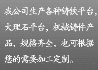 全意鑄鐵平臺平板廠家專注生產(chǎn)T型槽鑄鐵平臺,大理石氣浮實(shí)驗(yàn)石平臺,han接鑄鐵平臺,裝配鑄鐵平臺,檢測測量大理石平臺,試驗(yàn)鑄鐵平臺,測量大理石平板,T型槽平臺,電機(jī)試驗(yàn)平臺,三坐標(biāo)測量平臺等鑄鐵平板來圖加工定做業(yè)務(wù),以合理的價格,專注的技術(shù)服務(wù)于國內(nèi)外客戶,互利合作,共同發(fā)展!公司位于河北交河開發(fā)區(qū),京滬鐵路、104國道、106國道、京福高速公路橫穿而過,與我國的兩大直轄市北京、天津近在咫尺,地理位置優(yōu)越,交通非常便利。我公司本著以誠納客”“嚴(yán)把質(zhì)量關(guān)”“價格優(yōu)惠”“用戶至上的原則,幾十年兢兢業(yè)業(yè),受到用戶的一致好評!